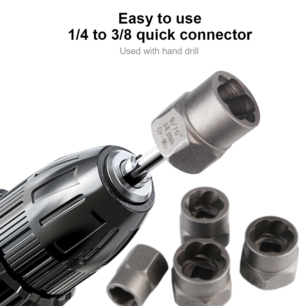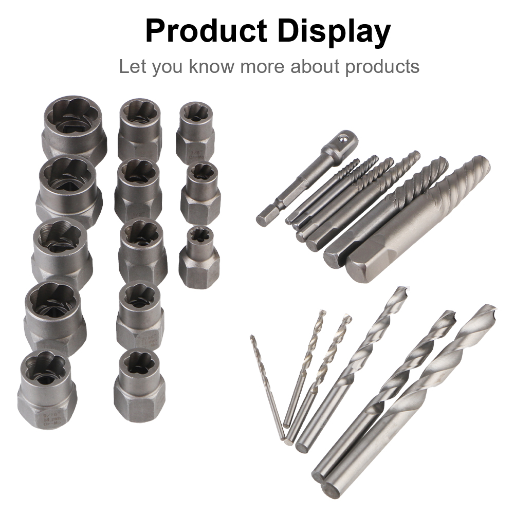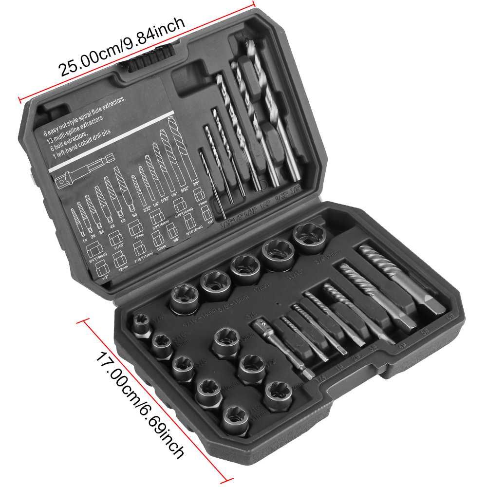 Feature: 100% new and high quality. 26Pcs Damaged nuts and bolts extractors Can be driven with a metric spanner or socket. Multi-Application: Suitable for removing most damaged, frozen, rusted fasteners including bolts, nuts, studs and screws. Before using spiral screw extractors to remove damaged screws, a drill bit must be used to drill the holes. Solid Carrying Case for Storage: 26 pieces tools are all packed in a rugged, compact carry case for storage and portability. Each tool fits snugly into its respective place to prevent moving around and scraping. Specification: Color:Black Nut & Bolt Extractor Size: 1/4inch, 5/16inch (8mm), 3/8 inch, 10mm, 7/16 inch (11mm), 1/2inch, 12mm, 13mm, 9/16inch (14mm), 5/8 inch (16mm), 17mm, 11/16 inch, 3/4 inch (19mm) Spiral Flute Extractors Size: 1#(3~6mm), 2#(6~8mm), 3#(8~11mm), 4#(11~15mm), 5#(14~18mm), 6#(17~21mm) Drill Bits Size: 5/64", 1/8", 5/32", 1/4", 9/32", 3/8" Size:1/4"-3/8" Hex Adapter Material:Chrome vanadium steel Package Includes: 1x26Pcs/Set Nut Extractor