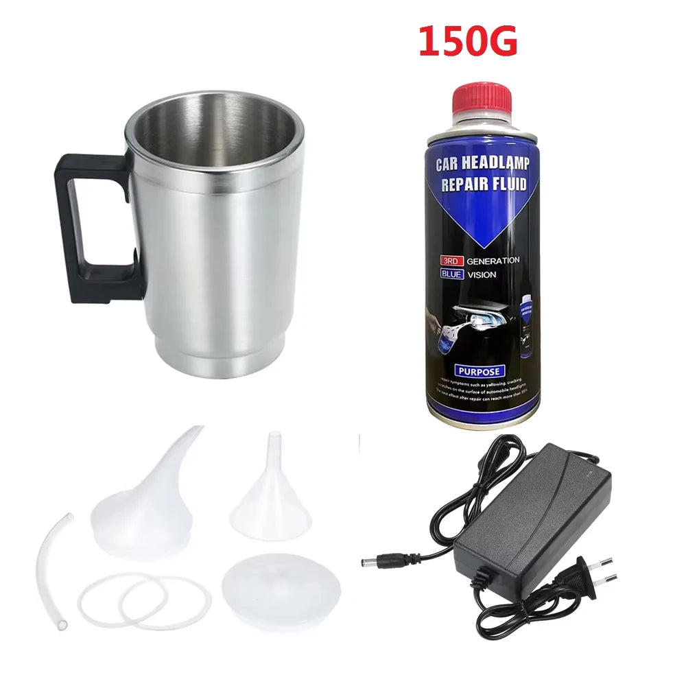 4. Pour the headlight repair solution into the atomizing cup, connect the power cord to the car cigarette lighter interface, and connect the atomizing cup. Just close the lid and get to work.